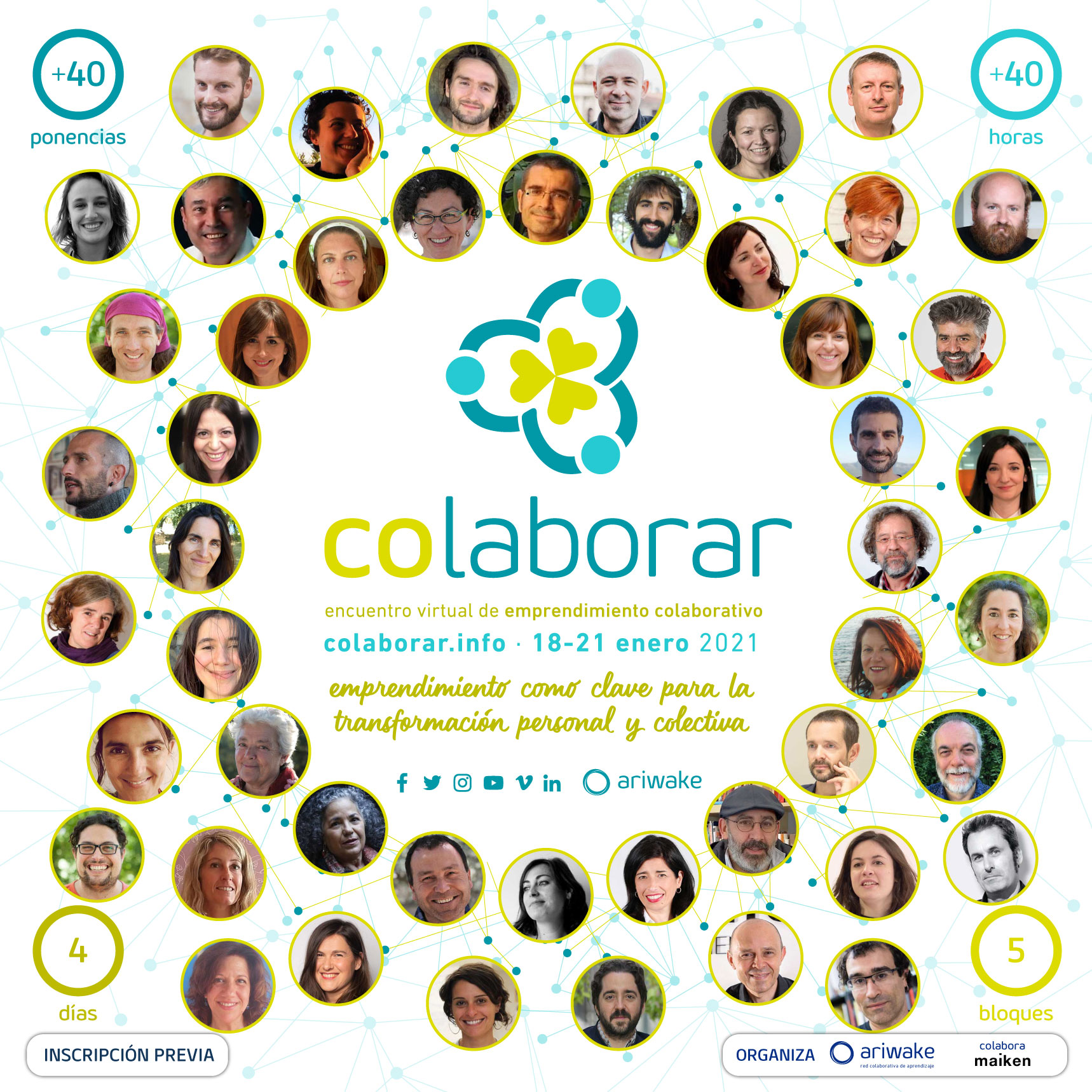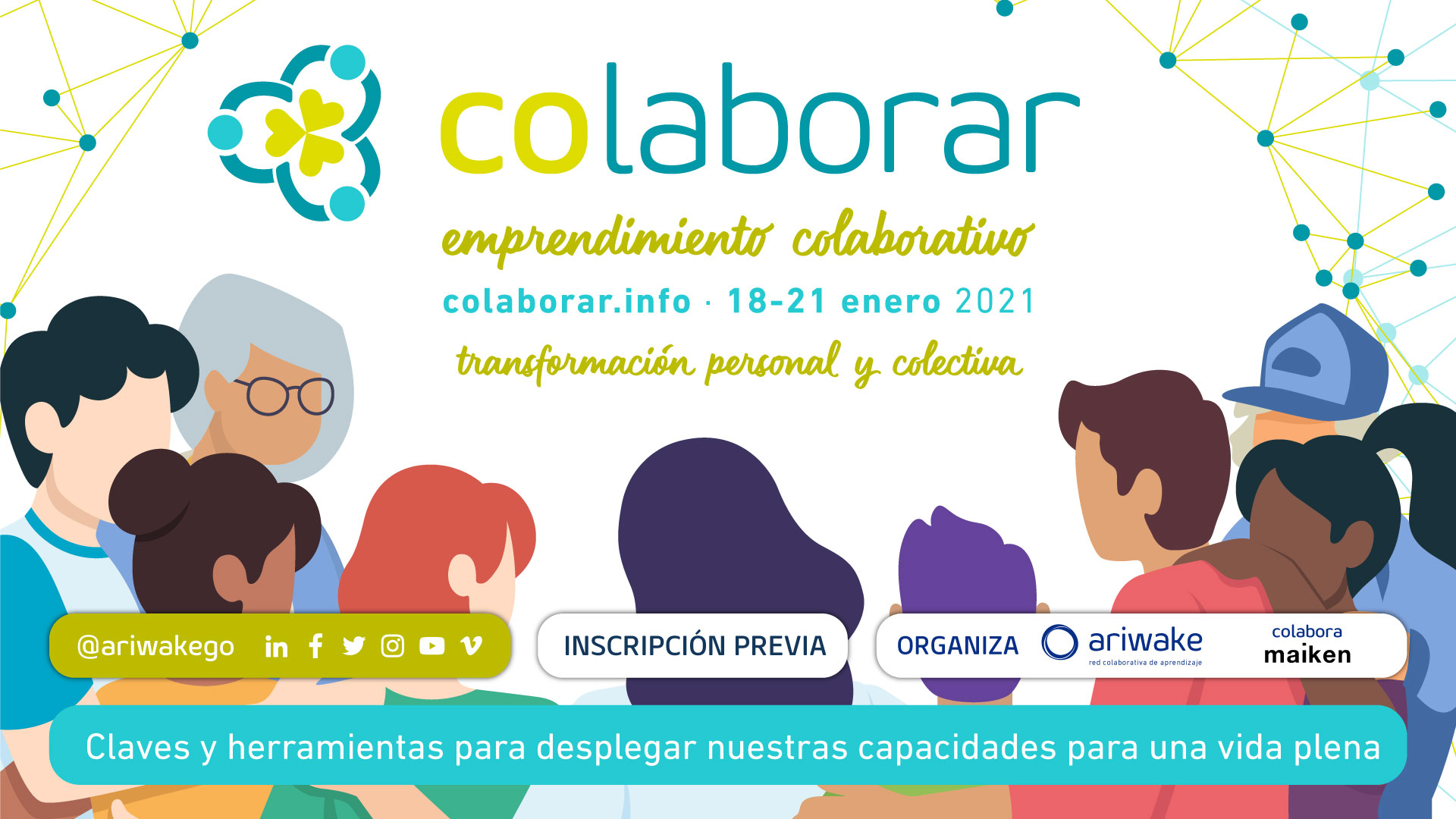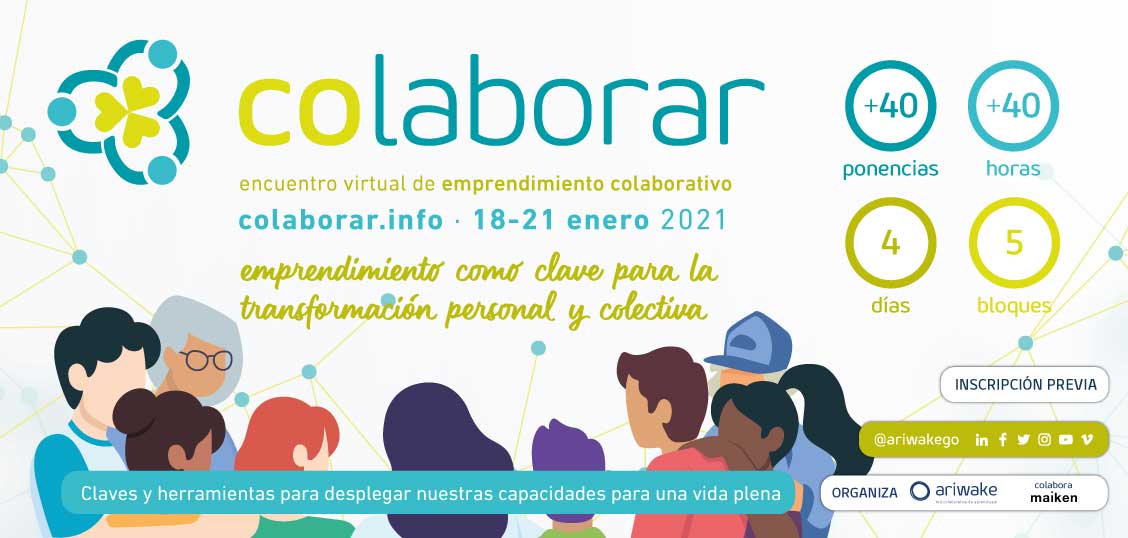 La cooperativa Ariwake organiza del 18 al 21 de enero COLABORAR, el primer encuentro virtual de emprendimiento colaborativo, como clave para la transformación personal y colectiva. Reunirá en www.colaborar.info a más de 40 profesionales y entidades, que ofrecerán experiencias de proyectos estatales e internacionales. El evento explora las claves de nuevos modelos emergentes que ponen a las personas y la vida en el centro, con herramientas para la cooperación, la innovación, la sostenibilidad, la implicación social y el desarrollo personal.